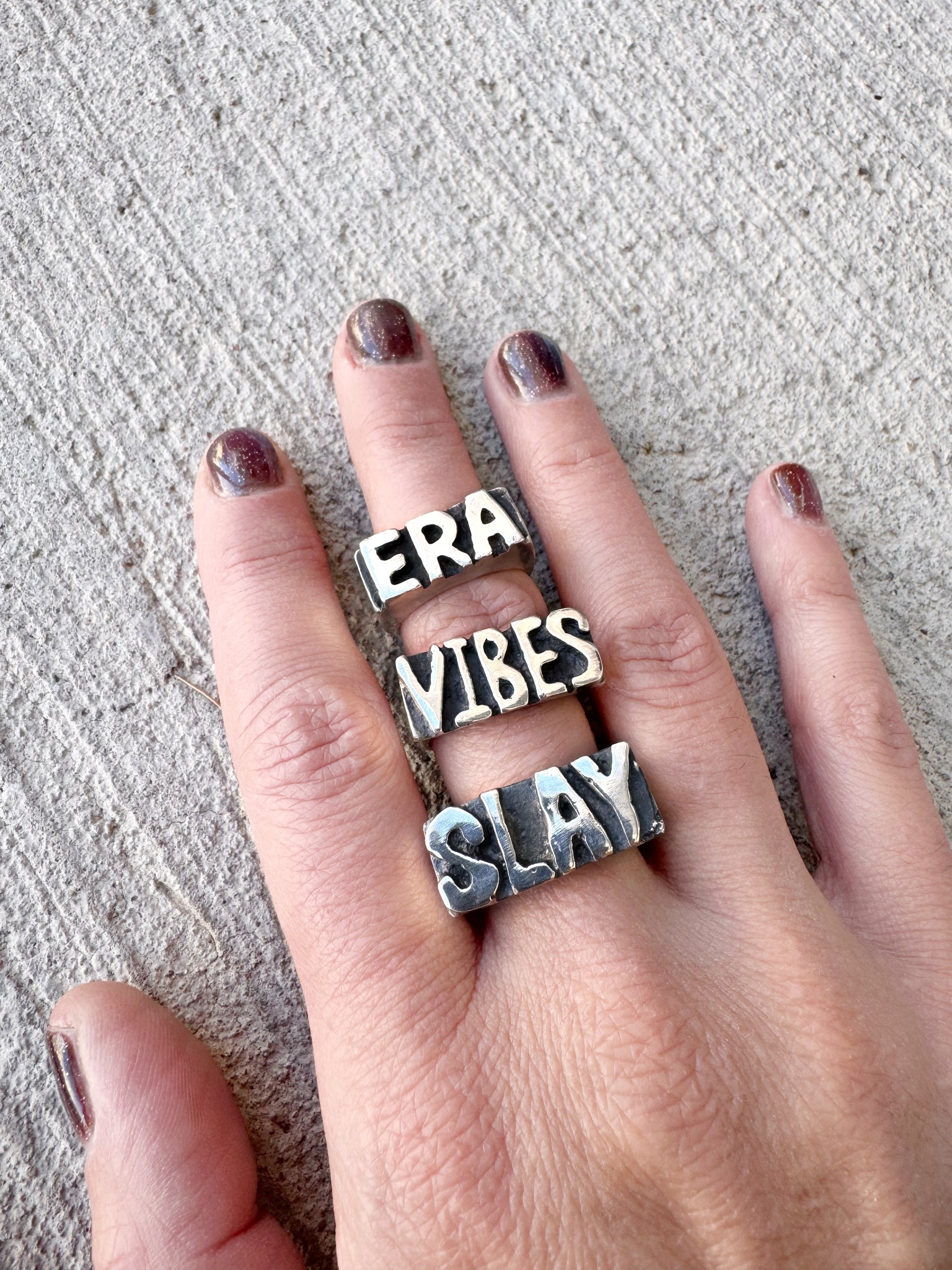 A modern signet ring for the language of now. The Zeitgeist Ring is a chunky, unisex silver band carved with the words that define a moment. It captures fleeting slang in something built to last. It nods to tradition while quietly rewriting it.